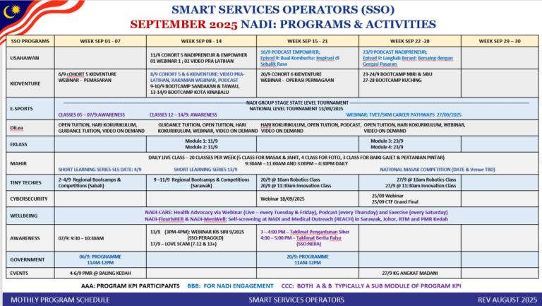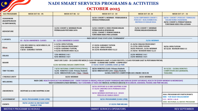 Sebarang maklumat terkini program di NADI boleh rujuk kepada Media sosial NADI dan Portal NADI kami :Facebook : https://www.facebook.com/NADIFeldaPalong7Titktok : https://www.tiktok.com/@nadi_felda_palong_7Intstagram : https://www.instagram.com/nadifeldapalong7Portal : https://feldapalong7.nadi.my/