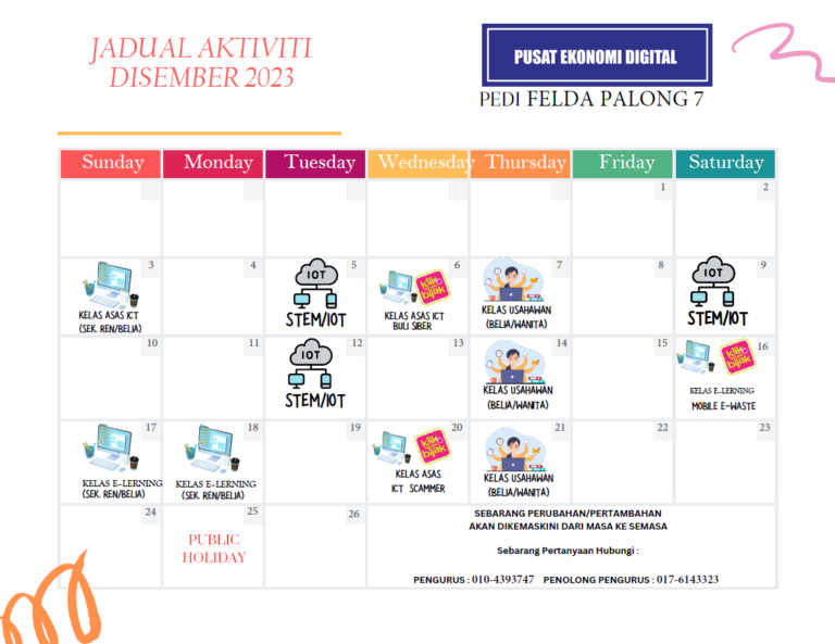 1.Latihan Keusahawanan – Poster Dalam Talian (Canva) TARIKH : 20 Disember 2023 MASA : 02.30 Petang – 04.30 Petang LOKASI : PEDi Felda Palong 7 PERSERTA : 1-4 ORANG RINGKASAN PROGRAM Membantu usahawan menghasilkan bahan digital seperti poster promosi perniagaan dan poster hebahan perniagaan masing-masing dengan lebih cepat dan menarik. […]