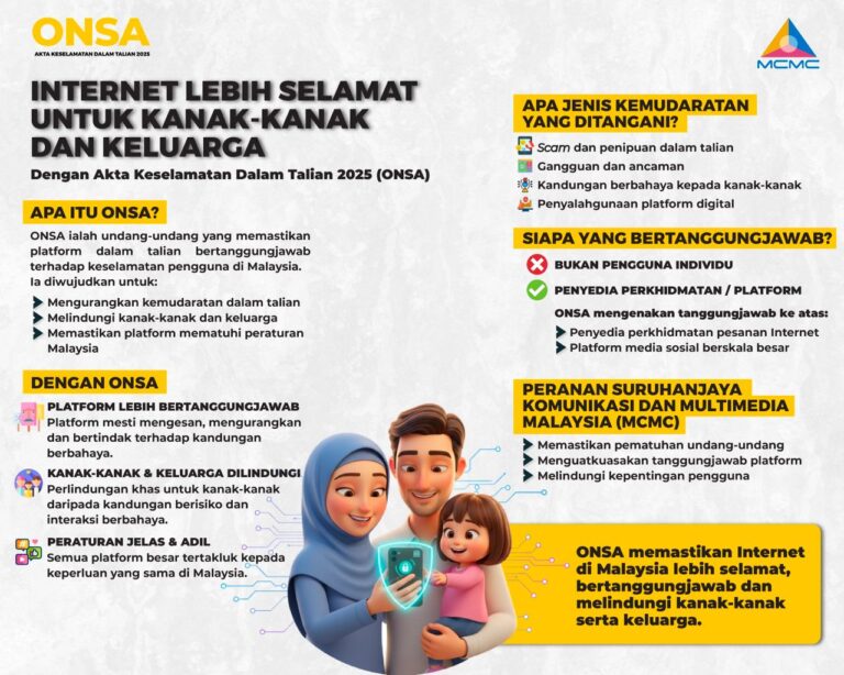 Akta Keselamatan Dalam Talian 2025 (ONSA) memperkukuh tanggungjawab platform digital demi keselamatan pengguna. Perlindungan kanak-kanak diutamakan, kandungan memudaratkan wajib ditangani. Keselamatan dalam talian bukan pilihan, ia tanggungjawab bersama. Maklumat lanjut mengenai ONSA boleh didapati di laman sesawang MCMC dihttps://mcmc.gov.my/en/onsa/home MCMC […]