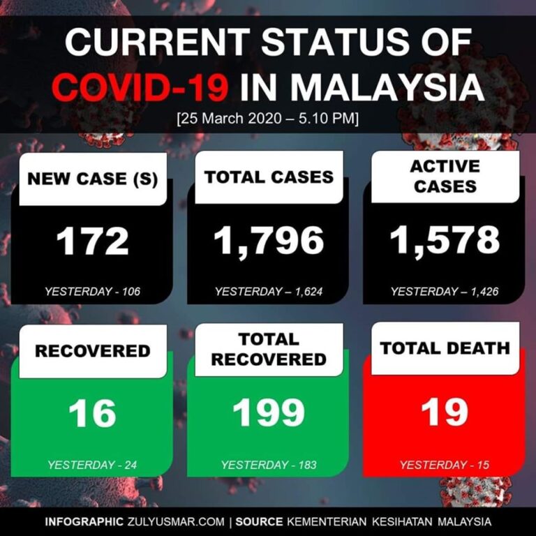 Kes baru : 172Jumlah keseluruhan : 1796Jumlah kes di ICU : 45Kes baru sembuh & dischaj : 16Jumlah keseluruhan yang sembuh : 199Jumlah kematian : 19 Kes kematian ke-18 adalah pesakit ke 1,625 lelaki warga tempatan berumur 56thn dan mempunyai […]