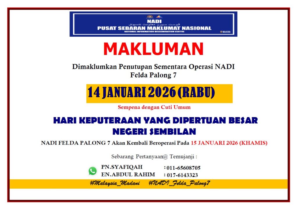 Dimaklumkan NADI Felda Palong 7 ditutup sementara pada